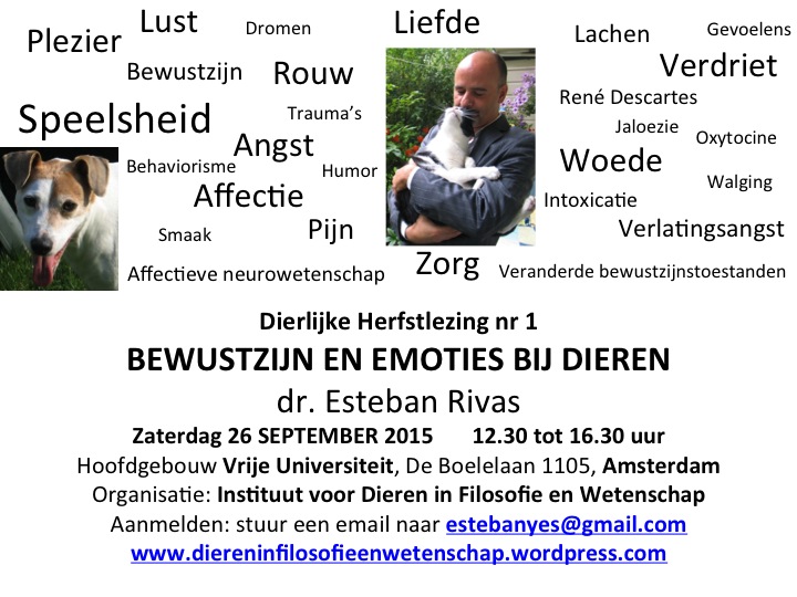 Zaterdag 26 september 2015: Bewustzijn en emoties bij dieren. Een overzicht van de discussie over bewustzijn bij dieren en van wetenschappelijk hersenen- en gedragsonderzoek m.b.t. gevoelens en emoties bij dieren.