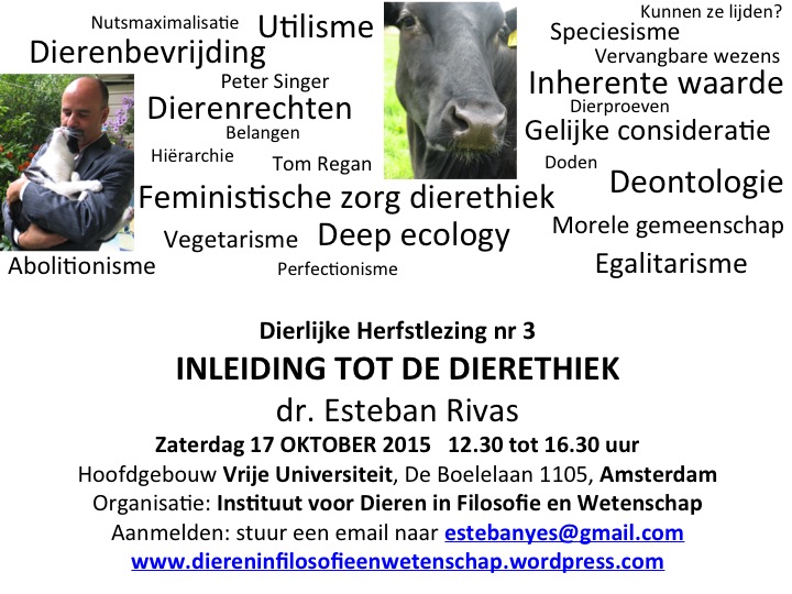 Zaterdag 17 oktober 2015: Inleiding tot de dierethiek. Introductie tot de belangrijkste stromingen in de dierethiek: hoe moeten we met andere dieren omgaan?