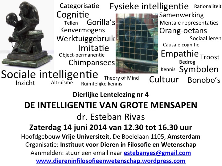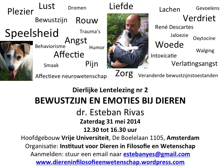 Omschrijving: Tijdens deze cursusdag gaat dr. Esteban Rivas in op de vraag of andere dieren net als mensen het vermogen hebben om positieve en negatieve dingen te beleven en te ervaren, zoals pijn en plezier. Zijn dieren robotten zonder beleving of ervaren dieren sensaties en andere zaken net als wij bewust? De Franse filosoof René Descartes beweerde dat dieren geen bewustzijn konden bezitten. Ook het behaviorisme binnen de psychologie leidde ertoe dat het onderwerp bewustzijn taboe werd verklaard. Ook hedentendage zijn er nog denkers die geen bewustzijn toeschrijven aan dieren, vaak op grond van afwezigheid van ‘hogere’ cognitieve vermogens en taal. Daartegenover staan posities die de aanwezigheid van bewustzijn beargumenteren op grond van de analogieredenering en nauwkeurige studie van het zenuwstelsel en het gedrag van dieren. Zo zal Rivas de affectieve neurowetenschap van Jaak Panksepp behandelen, waaruit blijkt dat tenminste alle zoogdieren en ook vogels allemaal een aantal hersencentra voor dezelfde emotionele systemen delen. Daarnaast zal er worden ingegaan op de concrete emoties van honden en allerlei andere dieren. Wat voor emoties kennen ze? Plezier, pijn, jaloezie, schuldgevoel, dankbaarheid? Hoe belangrijk is affectie en liefde in het leven van dieren? Welke dieren lijken te rouwen om overleden soortgenoten? Kunnen ratten, honden en apen lachen en hebben ze humor? Kunnen dieren trauma’s oplopen? En wat voor overeenkomsten bestaan er tussen mensen en andere dieren wat betreft het hebben van veranderde bewustzijnstoestanden, zoals dromen en het onder invloed zijn van psychofarmaca en drugs?