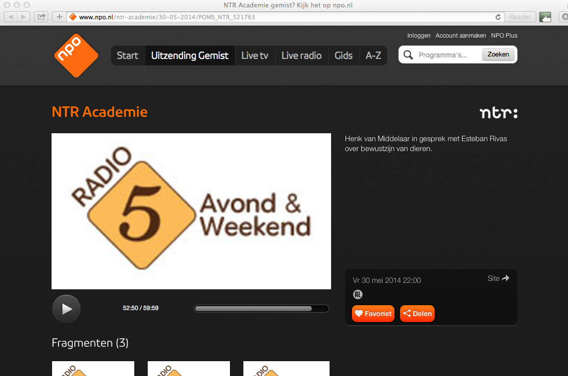 Omschrijving: Tijdens deze cursusdag gaat dr. Esteban Rivas in op de vraag of andere dieren net als mensen bewustzijn hebben, dat wil zeggen het vermogen om positieve en negatieve dingen te beleven en te ervaren, zoals pijn en plezier. Zijn dieren robotten zonder beleving of ervaren dieren sensaties en andere zaken net als wij bewust? De Franse filosoof René Descartes beweerde dat dieren geen bewustzijn konden bezitten. Ook het behaviorisme binnen de psychologie leidde ertoe dat het onderwerp bewustzijn taboe werd verklaard. Ook hedentendage zijn er nog denkers die geen bewustzijn toeschrijven aan dieren, vaak op grond van afwezigheid van ‘hogere’ cognitieve vermogens en taal. Daartegenover staan posities die de aanwezigheid van bewustzijn beargumenteren op grond van de analogieredenering en nauwkeurige studie van het zenuwstelsel en het gedrag van dieren. Zo zal Rivas de affectieve neurowetenschap van Jaak Panksepp behandelen, waaruit blijkt dat we met andere dieren een aantal hersenstructuren en neurochemie voor dezelfde emotionele systemen delen, zoals angst, agressie, sexuele lust, zorg en affectie, verdriet en speelsheid. En welke rol speelt het hormoon oxytocine bij het sociale gedrag van dieren? Rivas zal ook zijn eigen onderzoek behandelen naar het gebruik van emotie-gebaren door grote mensapen. Daarnaast zal er worden ingegaan op de concrete emoties van honden en allerlei andere dieren. Wat voor emoties kennen ze? Plezier, pijn, jaloezie, schuldgevoel, dankbaarheid? En zien we bij dieren ook gevoelens als trots, schaamte of wraak? Welke dieren lijken te rouwen om overleden soortgenoten? Kunnen ratten, honden en apen lachen en hebben ze humor? Kunnen dieren trauma’s oplopen? Hebben dieren ook een empathisch gevoel voor de ander? We zullen ingaan op emotionele besmetting en de vele recente studies naar besmettelijk geeuwen tussen dieren onderling. Ook kijken we naar verzoening en troost bij dieren en vormen van gerichte hulp aan een ander in nood. Spelen spiegelneuronen een rol bij empathie? En wat voor overeenkomsten bestaan er tussen mensen en andere dieren wat betreft het hebben van veranderde bewustzijnstoestanden, zoals dromen en het onder invloed zijn van psychofarmaca en drugs?