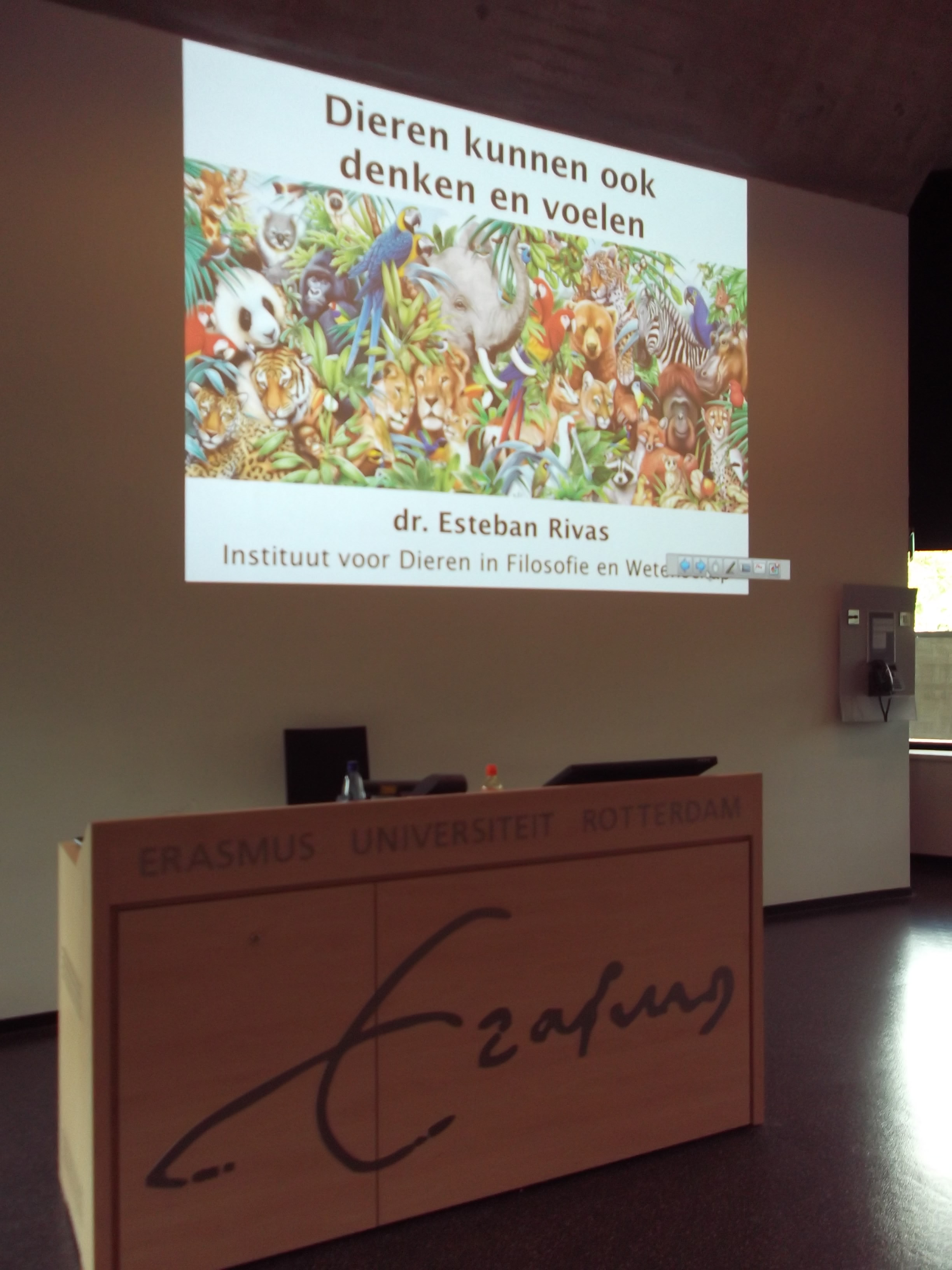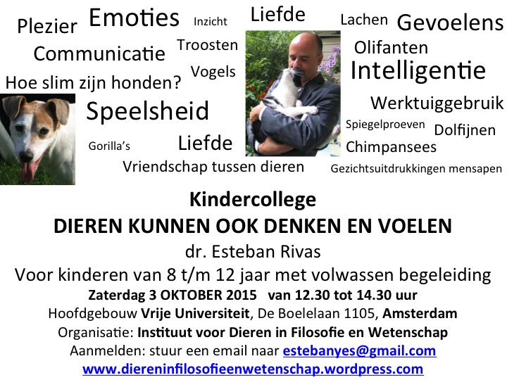 VignetKindercollegeDierendagOp Dierendag, zaterdag 4 oktober, organiseert het Instituut voor Dieren in Filosofie en Wetenschap een kindercollege met als titel “Dieren kunnen ook denken en voelen,” speciaal voor kinderen in de leeftijd van 8 t/m 12 jaar met volwassen begeleiding. DSCF5333Begin juli gaf psycholoog en filosoof dr. Esteban Rivas dit kindercollege aan het Hoger Onderwijs Voor Ouderen aan de Erasmus Universiteit Rotterdam. Er was grote belangstelling voor en uiteindelijk zat de zaal vol met meer dan 100 mensen, 56 kinderen en 48 volwassen begeleiders (in dit geval voornamelijk de grootouders van de kinderen). Op Dierendag zal dit kindercollege nu aan de Vrije Universiteit te Amsterdam worden georganiseerd. Beschrijving: In dit kindercollege gaan we op een eenvoudige en vrolijke manier een aantal boeiende ontdekkingen uit de wetenschap behandelen waaruit blijkt dat dieren net als mensen kunnen denken en voelen. We gaan in op de intelligentie van dieren: Hoe slim zijn honden? Hoeveel woorden kan een hond eigenlijk begrijpen? Waarover communiceren dieren met elkaar? Waarschuwen ze elkaar als er roofdieren aankomen? Welke dieren herkennen zichzelf in spiegels? En we gaan in op het gevoelsleven van dieren: Hebben dieren ook gevoelens en emoties? Hoe herken je de emoties in de gezichtsuitdrukkingen van mensapen? Bestaat er iets als liefde en vriendschap tussen dieren? Hoe spelen dieren met elkaar en kunnen ze lachen? Troosten dieren elkaar? Wat voor leuke banden kunnen er bestaan tussen dieren die tot twee hele verschillende diersoorten horen? Dr. Rivas zal met interessante feiten aan komen zetten, boeiend voor zowel jong als oud, waardoor je een goed beeld krijgt van de vele overeenkomsten tussen mensen en andere dieren. Het college zal worden opgeluisterd met veel foto’s, filmpjes, leuke dierengeluiden en een paar kleine proefjes. DSCF5340Voor wie? Het kindercollege is bedoeld voor kinderen van 8 t/m 12 jaar, met 1 of meer volwassenen als begeleiding. Kosten. De kosten voor deelname zijn 7,50 euro per kind en 12,50 per volwassene. Datum en tijd. Het college zal plaatsvinden op Dierendag, zaterdag 4 oktober 2014. Het begint om 12.30 en eindigt om 14.30 uur (met daarin een korte pauze). Locatie: Hoofdgebouw Vrije Universiteit, De Boelelaan 1105 te Amsterdam. Deze locatie is goed te bereiken met auto en openbaar vervoer. Gratis parkeren is mogelijk op de Gustav Mahlerlaan en de A.J. Ernstlaan. Aanmelden: U kunt zich eenvoudig opgeven door een emailbericht te sturen naar estebanyes@gmail.com. U krijgt dan een emailbericht toegestuurd met daarin alle praktische details en een factuur voor Uw administratie. DSCF5342 copy