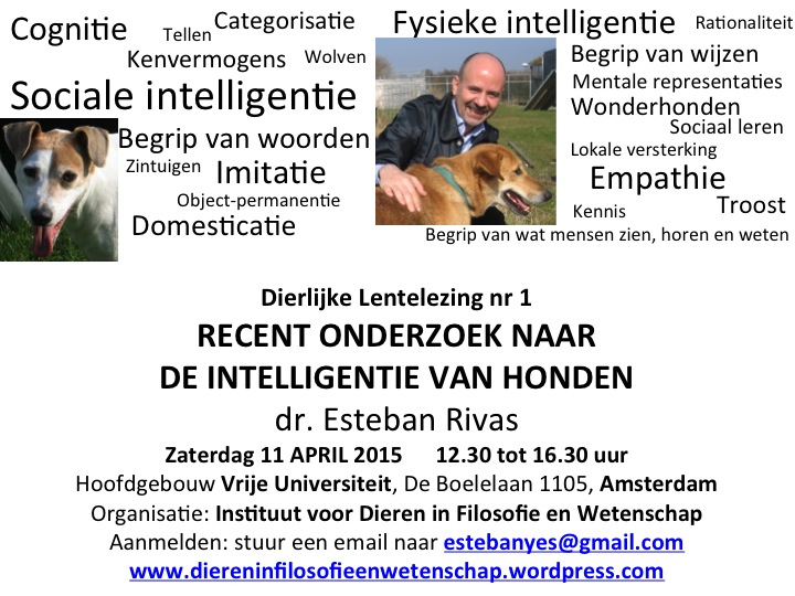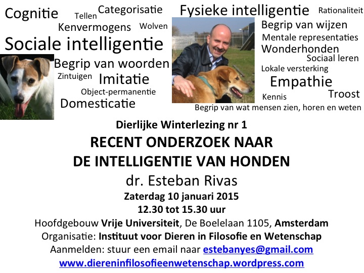 Dierlijke Winterlezing 1, zaterdag 10 januari 2015: Recent onderzoek naar de intelligentie van honden.VignetHondenintelligentie 10 januari EstebanenhondFaithDe afgelopen 20 jaar vinden er heel veel nieuwe studies plaats naar de intelligentie of cognitie van honden. Zo zijn er inmiddels aparte instituten opgericht aan universiteiten over de hele wereld waar intelligentie-onderzoek met honden wordt gedaan: het Family Dog Project aan de Universiteit van Boedapest (Adam Miklosi), de afdeling Vergelijkende en Ontwikkelingspsychologie van het Max Planck Instituut voor Evolutionaire Antropologie van de Universiteit van Leipzig (Juliane Kaminski en Michael Tomasello), het Clever Dog Lab aan de Universiteit van Wenen (Ludwig Huber) en het Duke Canine Cognition Center aan de Duke University in de Verenigde Staten (Brian Hare). Tijdens deze lezing zal dr. Rivas uitgebreid ingaan op de uitkomsten van al deze recente onderzoeken met honden. Centraal staan de thema’s sociale en fysieke intelligentie. Onderwerpen die aan bod zullen komen zijn o.a.: Begrijpen honden wat mensen zien, horen en weten? In hoeverre begrijpen honden menselijke communicatieve signalen zoals wijzen en blikrichting? Wat leren honden door sociale observatie, zijn ze in staat tot imitatie? Bestaat er bewijs voor empathie bij honden? Wat is er uit taalonderzoek met honden voortgekomen, kunnen honden menselijke woorden begrijpen? Waaruit bestaat de fysieke intelligentie van honden, wat begrijpen ze van hun fysieke omgeving? Hebben ze door dat voorwerpen blijven bestaan (object-permanentie) en hoe gedragen honden zich in spannende onderzoeken als de toverbeker? De lezing geeft U een goed overzicht van de huidige stand van zaken op het gebied van de wetenschappelijke kennis over de intelligentie van honden. Dat zal voor een deel ook Uw eigen beeld veranderen van waar honden toe in staat zijn qua intelligentie.