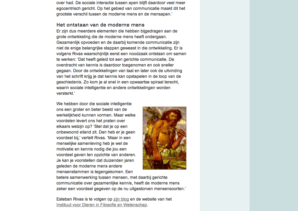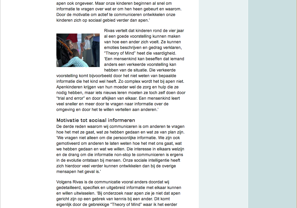 Omschrijving: Hoe groot is de sociale intelligentie van dieren? Welke dieren hebben een begrip van de visuele of auditieve waarneming van een ander? Volgen ze de blik van een ander? Letten ze er bij communicatie op dat de ander hen kan zien of horen? Houden ze ook rekening met de kennis van een ander, wat een ander wel of niet kan weten? Letten kraaiachtigen erop of anderen hen kunnen zien als ze hun voedsel verbergen? Snappen dieren de intenties of doelen van een ander? En kunnen dieren elkaar dingen leren en hebben ze daarin een begrip van een gebrek aan kennis bij de ander? Hoe goed zijn dieren in het begrijpen van onze menselijke communicatieve signalen zoals wijzen en blikrichting? Kunnen dieren elkaar bedriegen? En zijn ze in staat tot empathie: het zich kunnen verplaatsen in een ander? Welke dieren helpen elkaar, verzoenen en troosten elkaar na een conflict en vertonen prosociaal of altruïstisch gedrag? En wat zien we aan rouw bij dieren na het overlijden van een dierbare?