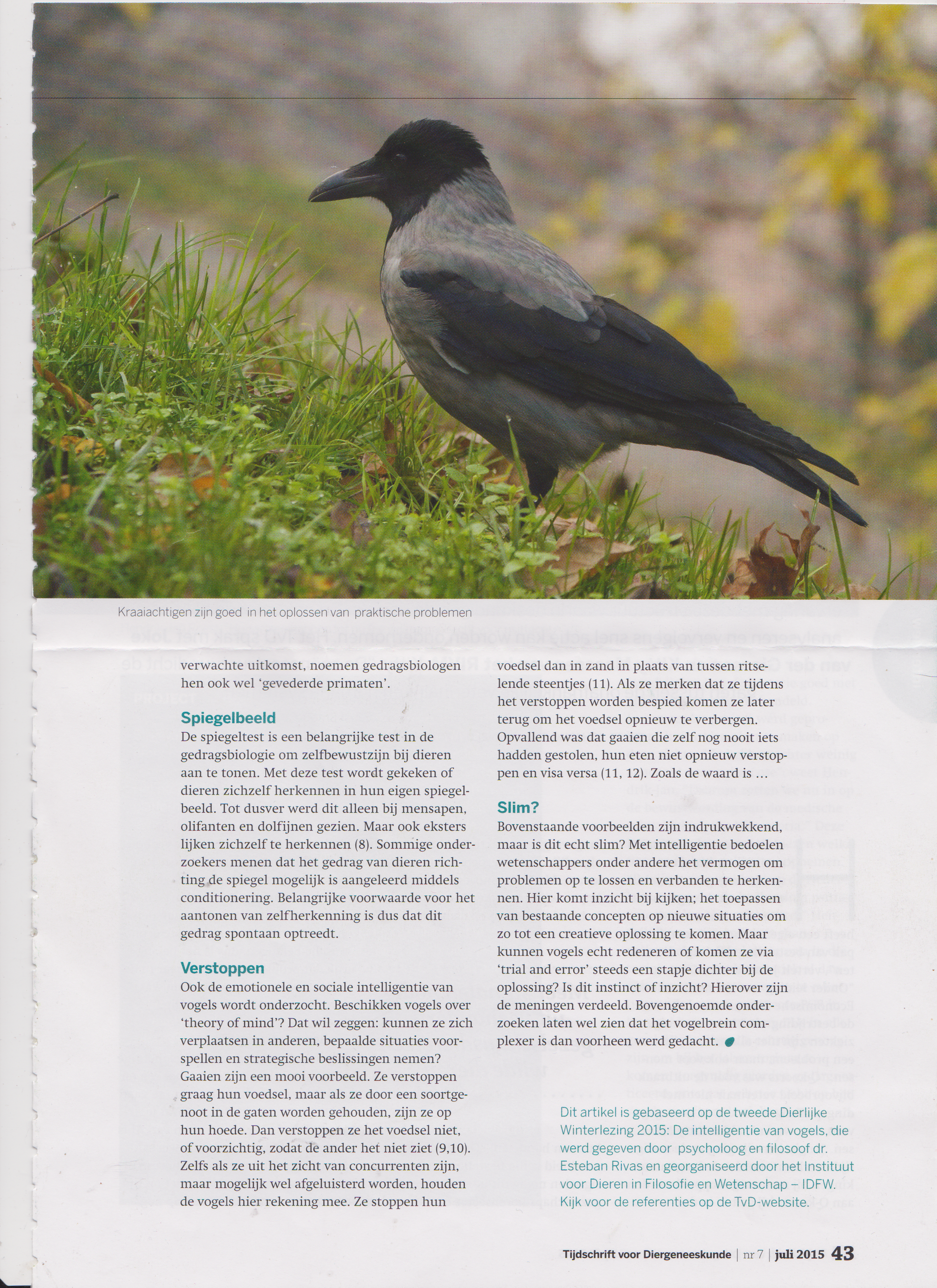 In deze lezing bespreekt dr. Esteban Rivas wat er uit de resultaten is gekomen van intelligentie-onderzoek met vogels. Lange tijd werd gedacht dat vogels domme dieren zijn omdat ze geen hersenschors of cortex bezitten zoals alle zoogdieren. Ook waren duiven de favoriete proefdieren van de behavioristen (omdat ze makkelijk te houden zijn), maar die conditioneerden de duiven alleen maar en zagen ze als stimulus-respons automaten. Met de cognitieve revolutie eind jaren ’60-70 van de vorige eeuw kwam er in de psychologie en biologie weer meer aandacht voor de intelligentie of cognitie van dieren. Sindsdien zijn er allerlei nieuwe ontdekkingen gedaan over de intelligentie van vogels en zien we de afgelopen decennia heel veel nieuwe studies met bijvoorbeeld kraaiachtigen en papegaai-achtigen. De volgende onderwerpen zullen in de lezing aan bod komen: De hersenen van vogels. Taalonderzoek met Alex en andere grijze roodstaartpapegaaien die menselijke woorden kunnen leren uitspreken en correct gebruiken. Basale intelligentie: welke vogels snappen object permanentie, het besef dat een voorwerp of een persoon blijven bestaan ook al zijn die even niet waarneembaar. Welke concepten snappen duiven? Hebben ze een concept van “mens” en van “duif”? En kunnen ze zelfs schilderijen van impressionisten onderscheiden van de werken van abstracte kunstenaars? Hebben vogels een concept van “gelijk” en “verschillend”? Hoe leren vogels de vogelzang en wat drukken vogels uit met hun verschillende roepen? Hoe goed is het geheugen van vogels? Kunnen kraaien zich herinneren welke mens hen jaren geleden ving om hen te ringen? Kunnen vogels zichzelf herkennen in een spiegel? Hoe goed is de ruimtelijke cognitie van vogels? En hoe slim zijn ze als het gaat om fysieke voorwerpen, werktuigen en allerlei ingewikkelde apparaten waar ze voer uit moeten halen? Kunnen vogels handelingen van anderen imiteren? En wat zien we aan Theory of Mind bij vogels: het toeschrijven van mentale toestanden als zien, willen of weten aan een ander? Bedriegen kraaiachtigen elkaar als ze merken dat een ander aanwezig is bij het verstoppen van voedsel? En rouwen vogels als een dierbare overlijdt?